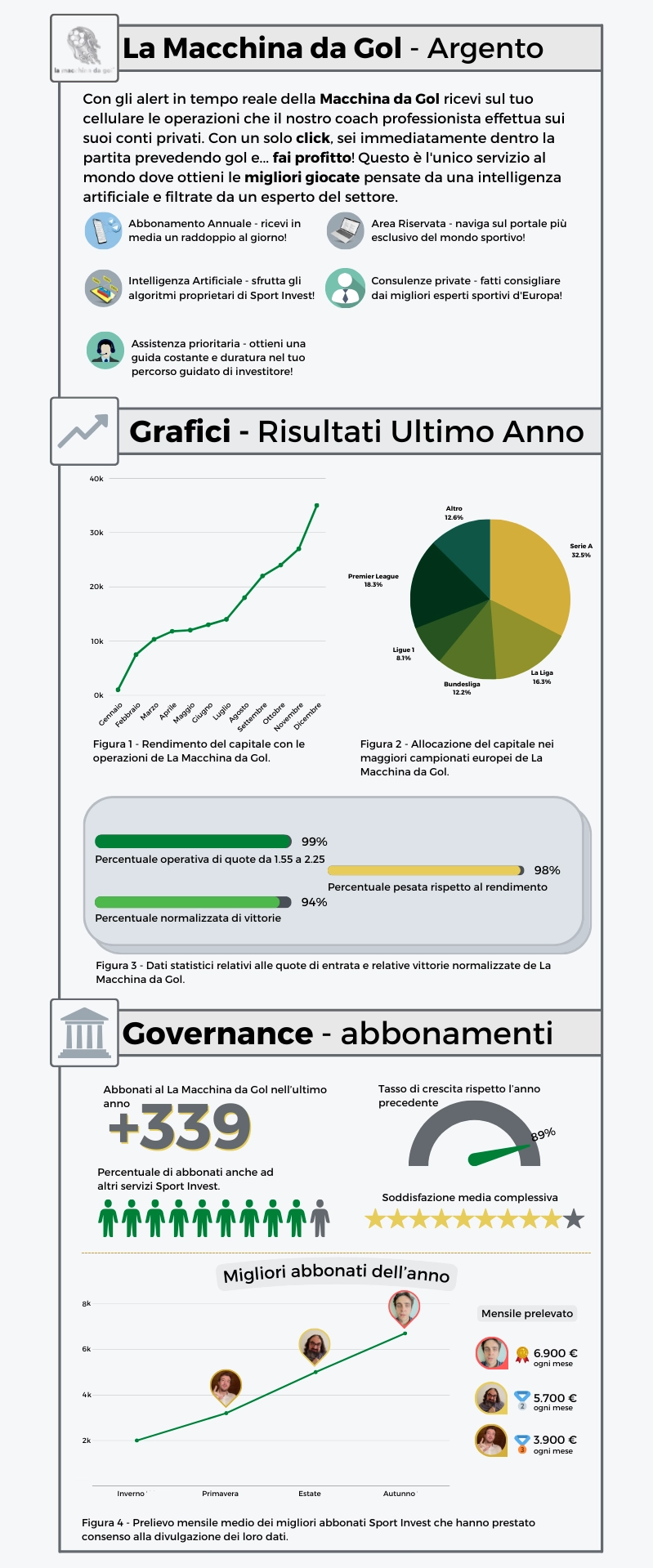 14.2 Offriamo diversi piani di abbonamento, compresi abbonamenti offerti da terze parti in aggiunta a prodotti e servizi propri. Alcuni piani di abbonamento potrebbero comportare diverse condizioni e limitazioni che ti verranno rese note al momento della registrazione o tramite altri metodi di comunicazione messi a tua disposizione. Potrai trovare informazioni specifiche in merito al tuo abbonamento Sport Invest visitando il sito web sportinvest.org e cliccando sul link “Gestione Profilo” pagina “Abbonamenti”, disponibile nella parte inferiore dell’area riservata utente, sportinvest.org/dashboard