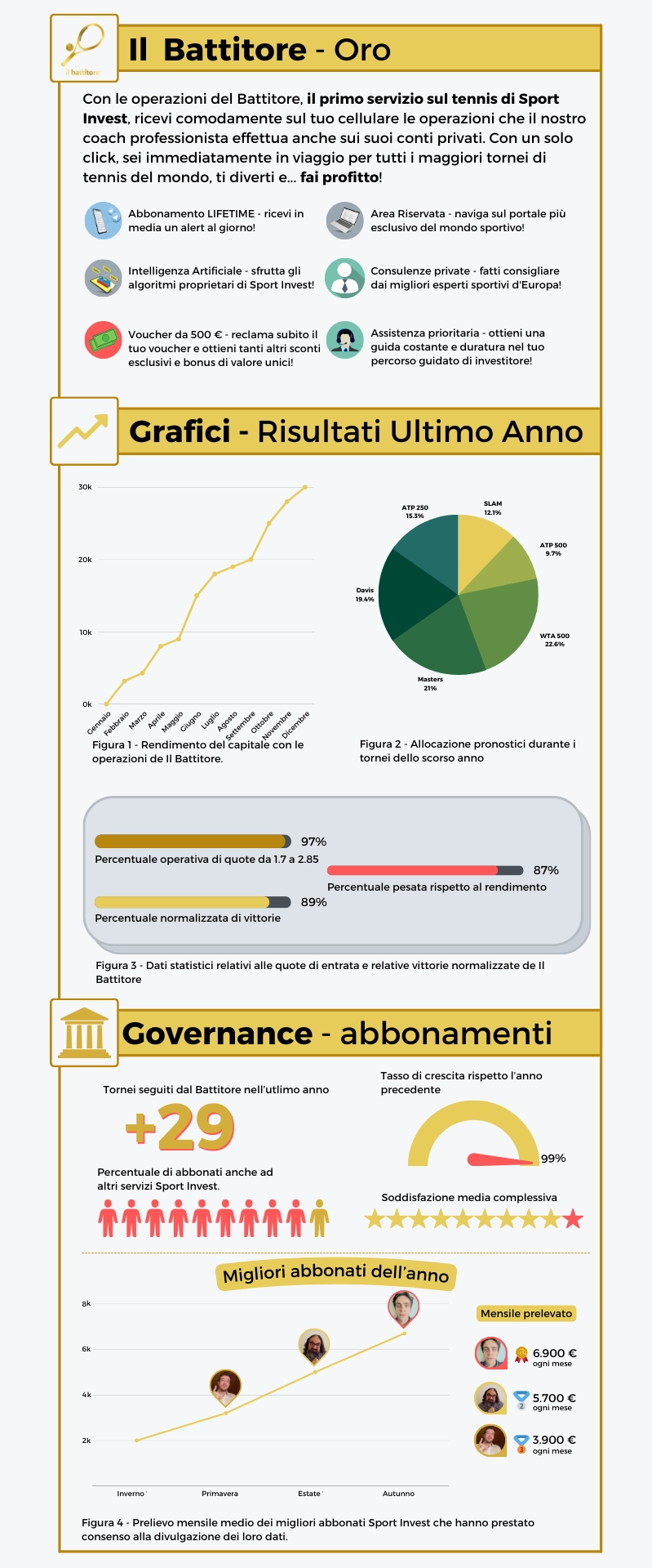 14.2 Offriamo diversi piani di abbonamento, compresi abbonamenti offerti da terze parti in aggiunta a prodotti e servizi propri. Alcuni piani di abbonamento potrebbero comportare diverse condizioni e limitazioni che ti verranno rese note al momento della registrazione o tramite altri metodi di comunicazione messi a tua disposizione. Potrai trovare informazioni specifiche in merito al tuo abbonamento Sport Invest visitando il sito web sportinvest.org e cliccando sul link “Gestione Profilo” pagina “Abbonamenti”, disponibile nella parte inferiore dell’area riservata utente, sportinvest.org/dashboard
