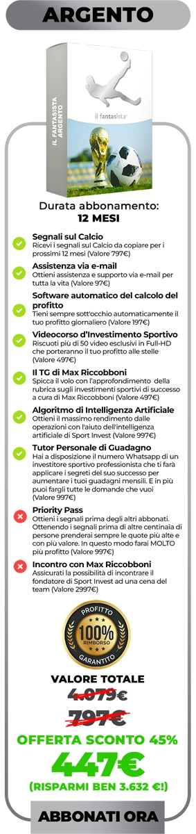 Abbiamo deciso di offrire a chi ha già dimostrato interesse e impegno attraverso l’acquisto del libro “Il Metodo Sport Invest” un’opportunità irripetibile: solo per i primi 21 giorni dall’acquisto del libro, potrai accedere al servizio che ha fatto la storia dell’investimento sportivo con uno sconto fino al 50%.